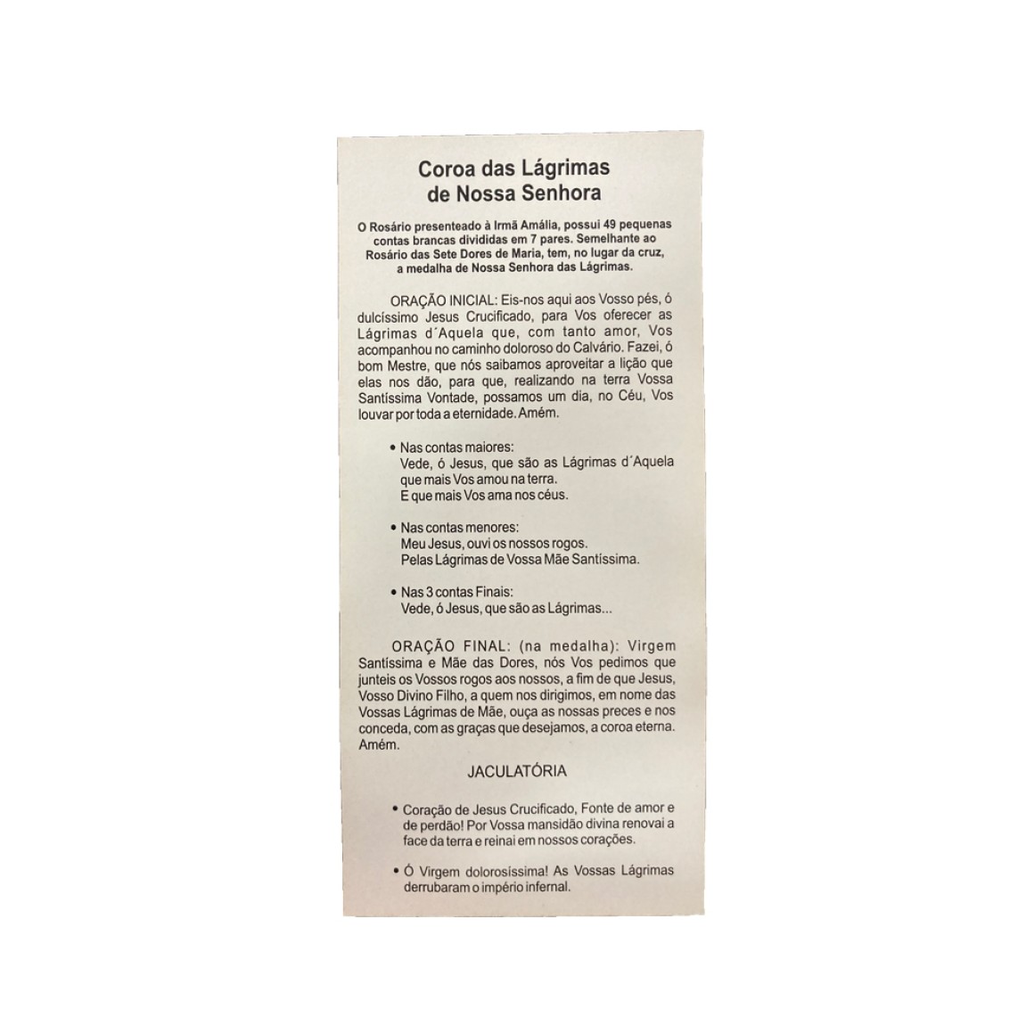 *Folheto Explicando Como Rezar a Coroa De N. Sra. Das Lágrimas 100un. - 15x7cm.